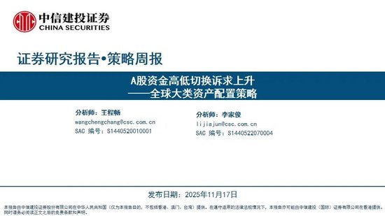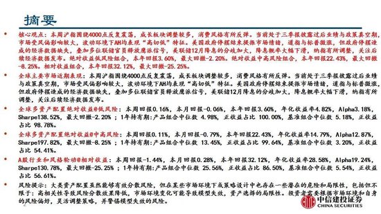 本周沪指围绕4000点反复震荡,成长板块调整较多,消费风格有所反弹。当前处于三季报披露过后业绩与政策真空期,市场受风偏影响较大,波动环境下AH均表现“高切低”特征。美国政府停摆结束提振市场情绪,道指与标普微涨,但政府停摆造成的经济数据缺失,叠加多位联储官员释放鹰派信号,美联储12月降息的分歧加大,降息概率大幅下滑,纳指有所调整,关注后续经济数据发布。绝对收益低风险组合,本年回报3.60%,最大回撤-2.20%。绝对收益中高风险组合,本年回报22.43%,最大回撤-8.25%。相对收益组合,本年回报32.12%,最大回撤-25.25%。