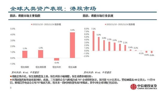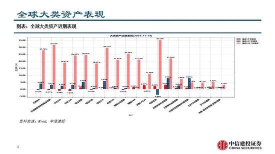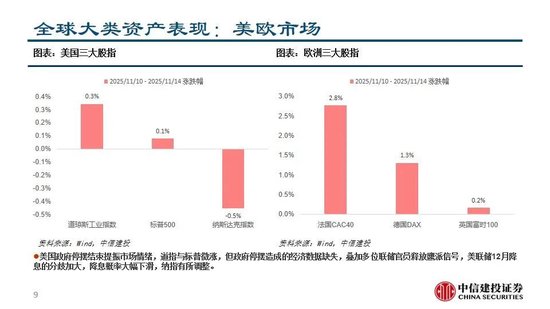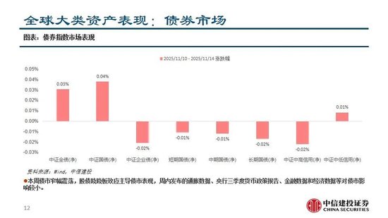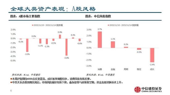 全球主要市场近期表现:本周沪指围绕4000点反复震荡,成长板块调整较多,消费风格有所反弹。当前处于三季报披露过后业绩与政策真空期,市场受风偏影响较大,波动环境下AH均表现“高切低”特征。美国政府停摆结束提振市场情绪,道指与标普微涨,但政府停摆造成的经济数据缺失,叠加多位联储官员释放鹰派信号,美联储12月降息的分歧加大,降息概率大幅下滑,纳指有所调整,关注后续经济数据发布。