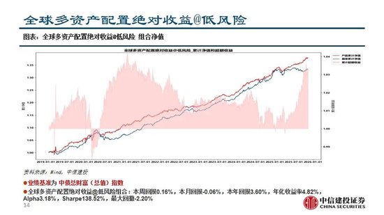 全球多资产配置绝对收益@低风险:本周回报0.16%,本月回报-0.06%,本年回报3.60%,年化收益率4.82%,Alpha3.18%,Sharpe138.52%,最大回撤-2.20% ;1年持有期:产品组合中位数 4.98%, 正收益占比 100.00%,基准组合中位数 5.18%,正收益占比 98.78%。